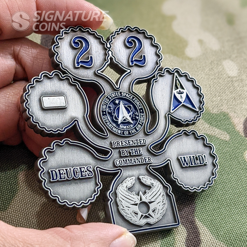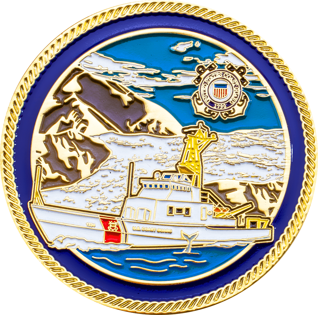 Sometimes a limited number of cut outs is better for enhancing your design. This Coast Guard coin only has two cut outs, but their effect on the coin are undeniable.