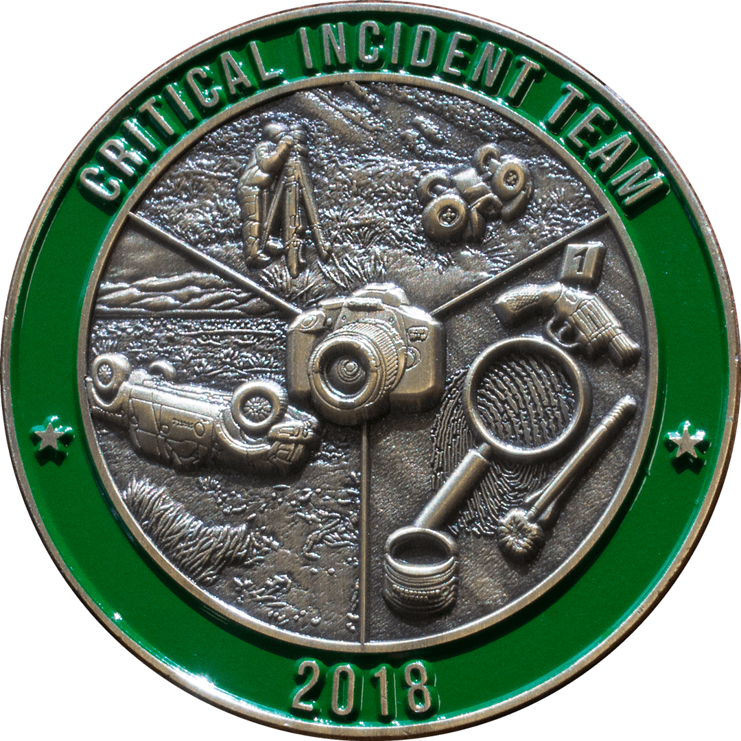 With highly detailed 3D artwork and a simple, single color green enamel colorfill area, this Critical Incident Team coin perfectly mixes classic design with innovative techniques.